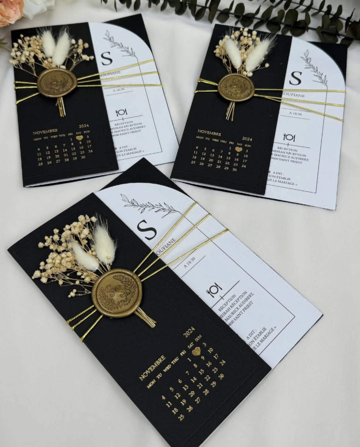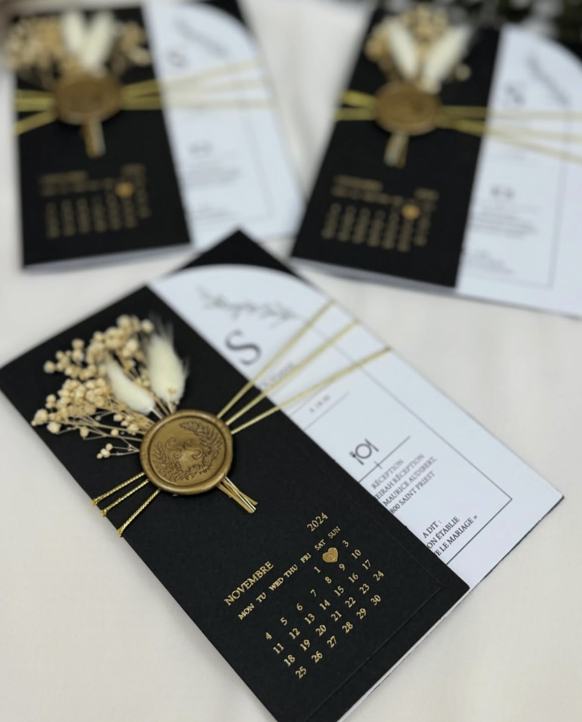 Finition Bohème-Luxe : L'ensemble est noué par une ficelle dorée et scellé par un sceau de cire or antique (avec les initiales S & S), complété par un charmant bouquet de fleurs séchées claires (Lagurus, Gypsophile).