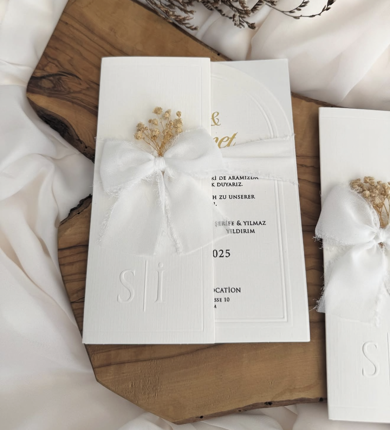 La Structure Pliable (Fonctionnelle) : Le format "pliable" (possiblement une pochette qui se déplie en deux ou trois parties) est extrêmement pratique pour organiser les différents inserts (Carte RSVP, informations, hébergement). Il transforme l'ouverture en une expérience.