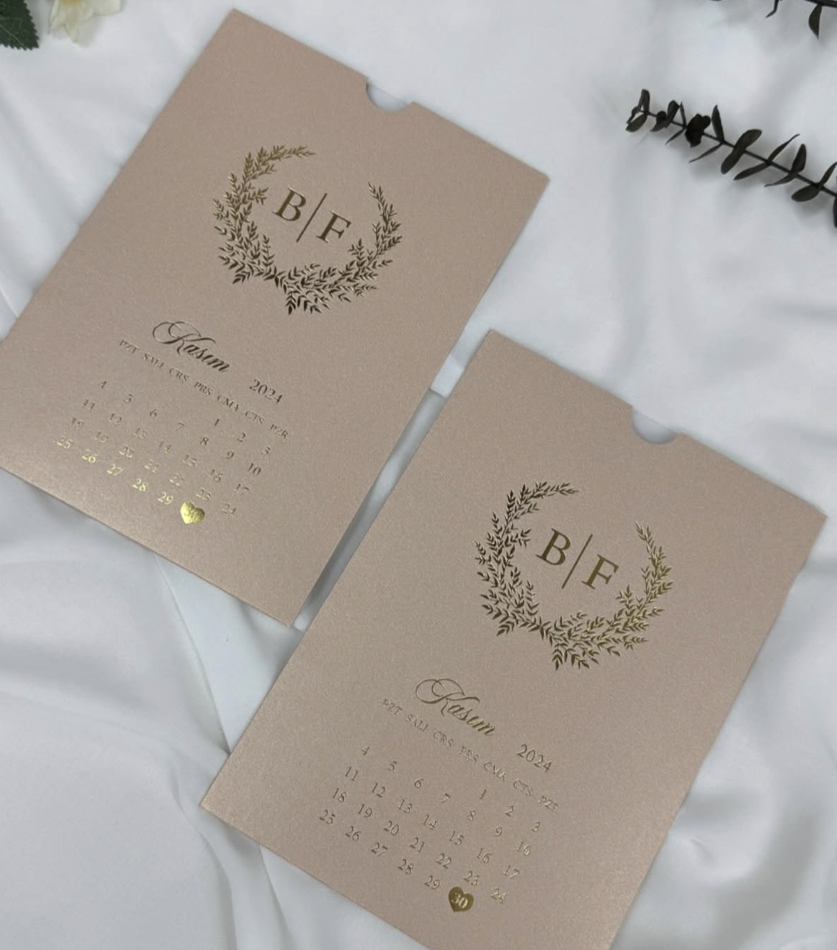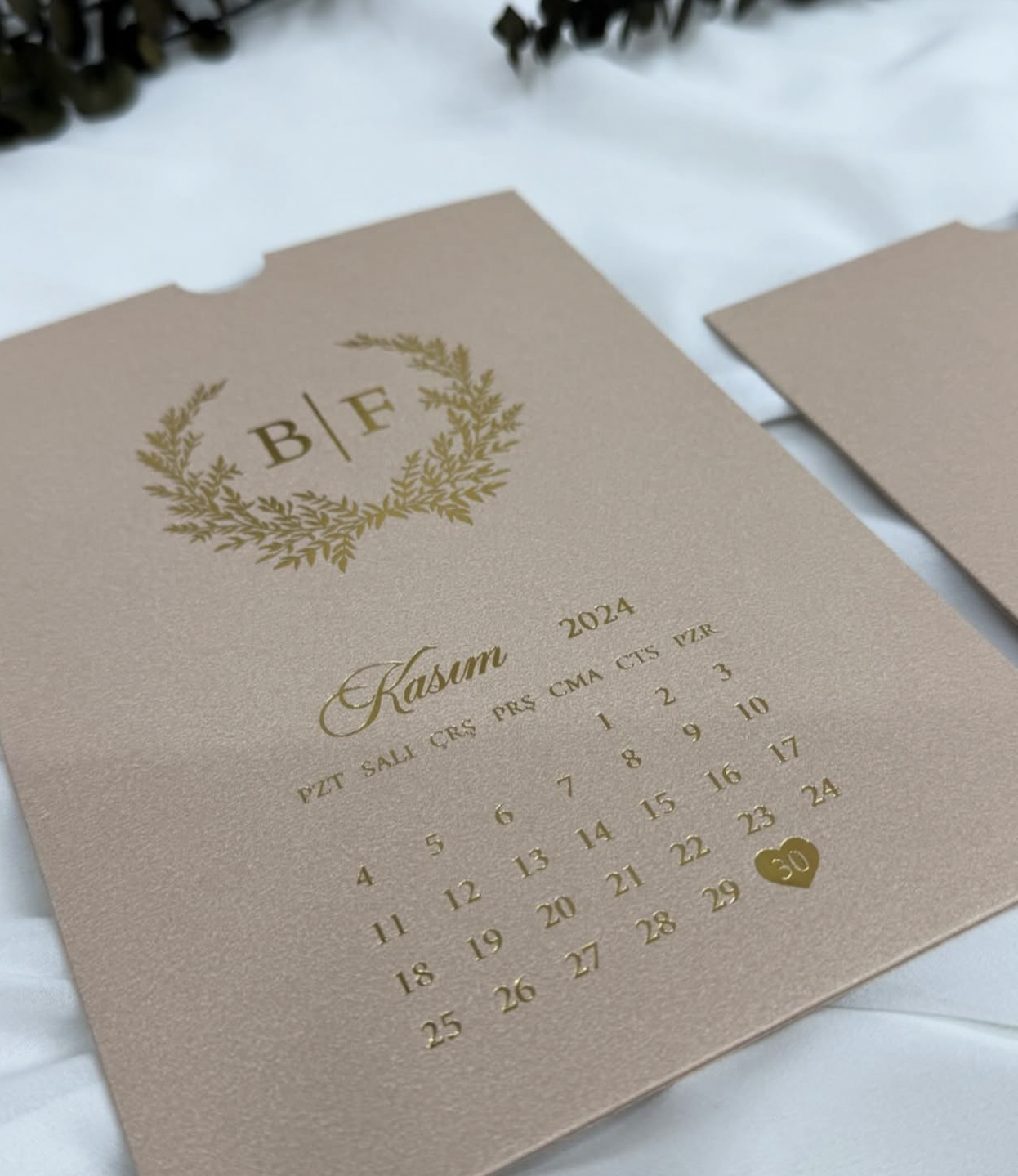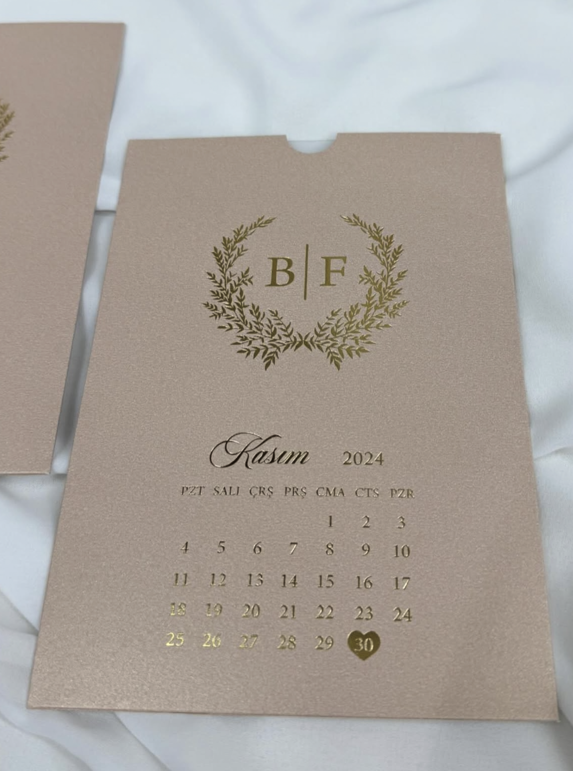 Calendrier Intégré : Le devant de la pochette affiche le mois de l'événement (Novembre 2024), servant de "Save the Date" pratique et décoratif, avec un petit cœur doré sur le jour J.
