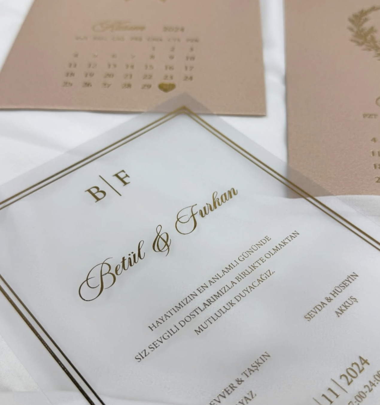 Carte Principale Transparente : L'invitation principale est imprimée sur un papier Vellum (Calque) transparent, rehaussé d'un encadrement et d'un texte en dorure Or brillant.