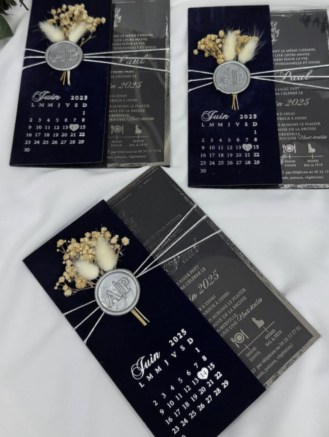Pochette Calendrier bleu nuit type "Velours" : La carte transparente est glissée dans une pochette noire à rabat, dont l'extérieur affiche un calendrier pour un "Save the Date" pratique.