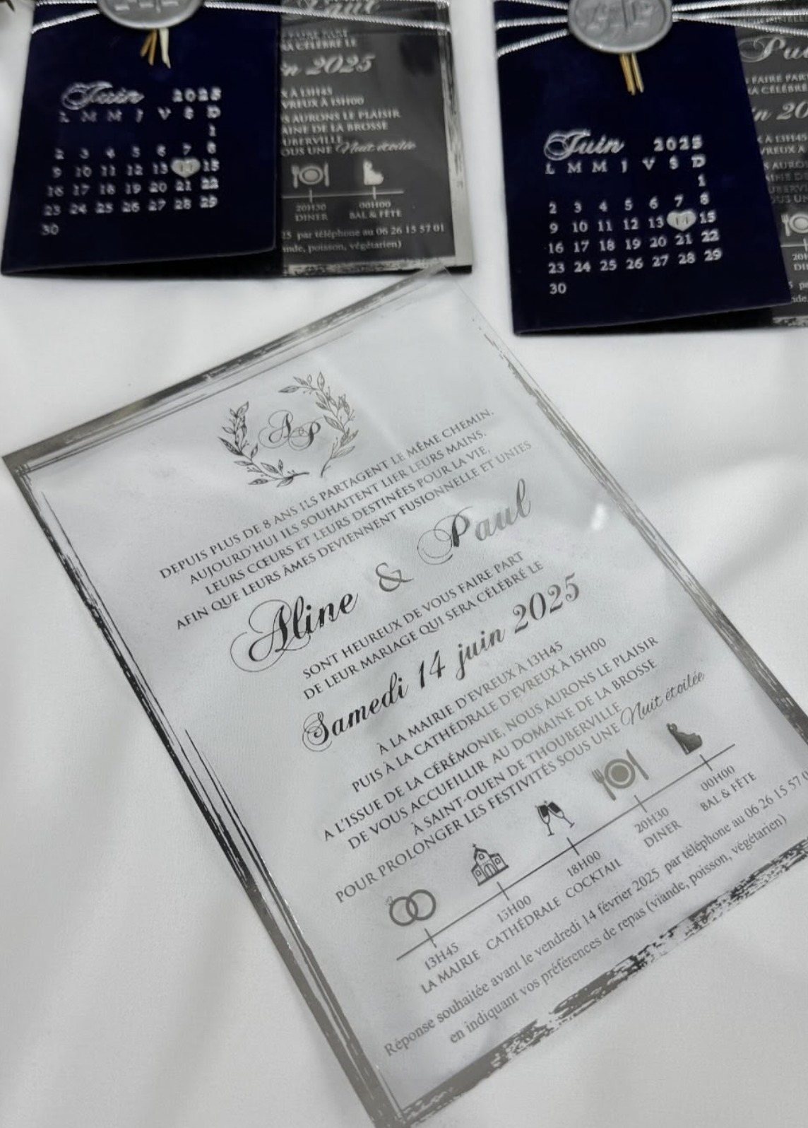 Carte Principale Transparente : Le texte de l'invitation est imprimé sur une matière transparente rigide, offrant un effet de flottaison moderne et sophistiqué.