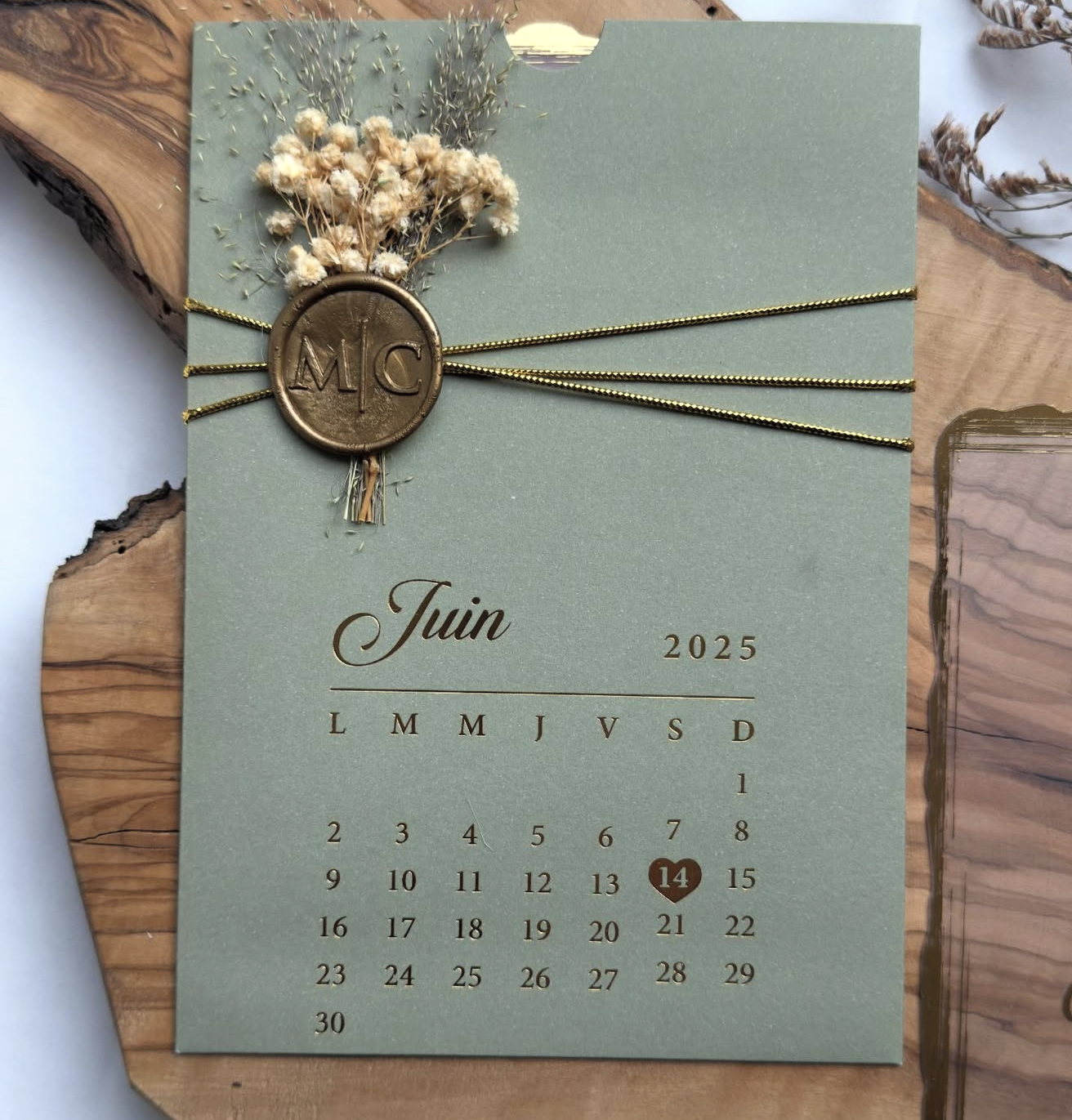 Touche Végétale : Un petit bouquet de feuilles séchées (eucalyptus ou fougère) est glissé sous le sceau, renforçant l'aspect botanique du design.